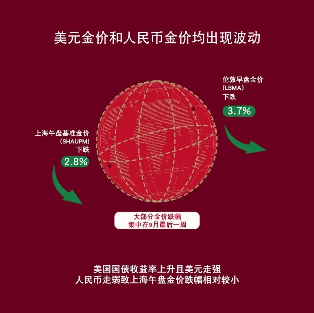 9月,以美元计价的伦敦LBMA早盘金价和以人民币计价的上海SHAUPM午盘基准金价分别下跌3.7%和2.8%,二者在三季度结束时表现各异