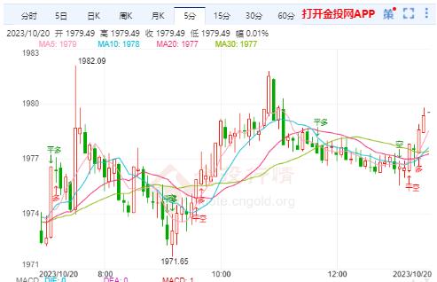 周五(10月20日)本交易日现货黄金持续上涨,今日开盘报1973.31美元/盎司,最高触及1982.09美元/盎司,最低触及1971.65美元/盎司,截止发稿金价报1979.37美元/盎司,涨幅0.29%。