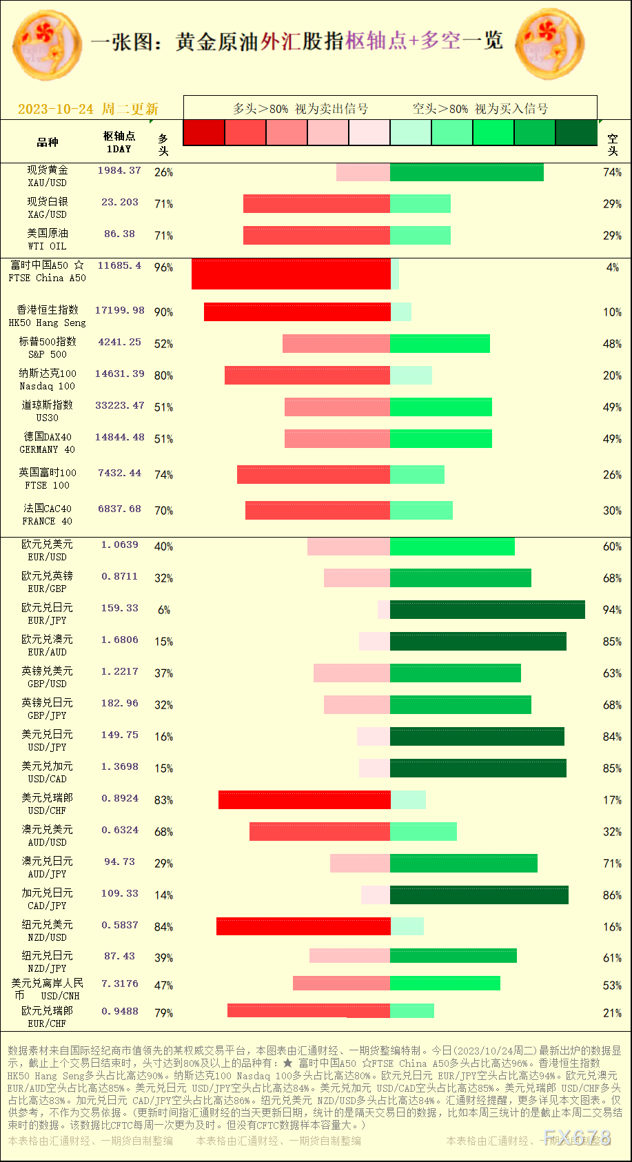 汇通财经APP讯——一张图:黄金原油外汇股指“枢纽点+多空占比”一览。今日(2023/10/24周二)最新出炉的数据显示,截止上个交易日结束时,头寸达到80%及以上的品种有:★ 富时中国A50 ☆FTSE China A50多头占比高达96%。香港恒生指数 HK50 Hang Seng多头占比高达90%。纳斯达克100 Nasdaq 100多头占比高达80%。欧元兑日元 EUR/JPY空头占比高达94%。欧元兑澳元EUR/AUD空头占比高达85%。美元兑日元 USD/JPY空头占比高达84%。美元兑加元 USD/CAD空头占比高达85%。美元兑瑞郎 USD/CHF多头占比高达83%。加元兑日元 CAD/JPY空头占比高达86%。纽元兑美元 NZD/USD多头占比高达84%。汇通财经提醒,更多详见本文图表。仅供参考,不作为交易依据。