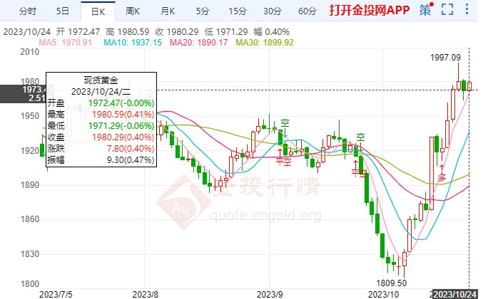 本周二,10月24日黄金盘内开启窄幅涨势,日内金价区间维持慢涨走势。北京时间10:49,黄金暂报1976.80。