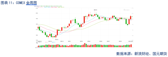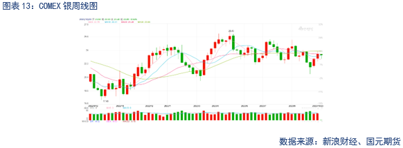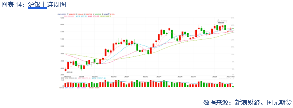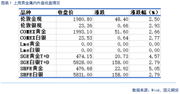 白银价格上周大幅上涨。与黄金类似,在美元走弱以及避险需求的影响下,白银走强。白银本身涨跌幅较大,短期内应注意回调的风险。