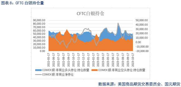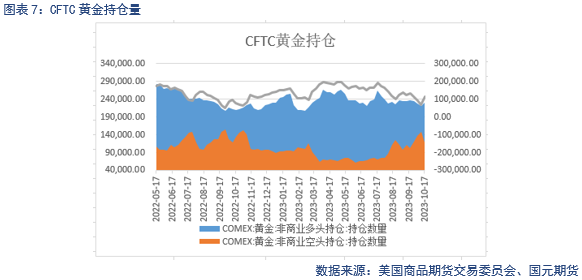 截止10月17日,黄金非商业多头持仓为231412张,较上周增加11080张,非商业空头持仓为118674张,较上周减少30225张,基金净持仓增加41305张,多头进场,空头离场;截止10月17日的周度统计周期中,白银非商业多头持仓为50749张,较上周增加412张,非商业空头持仓为31003张,较上周减少7035张,基金净持仓增加7447张,多头进场,空头离场。