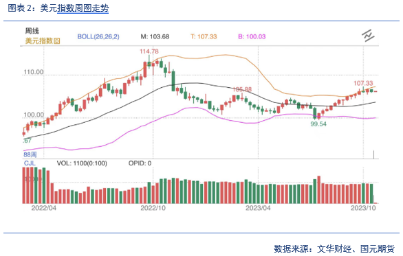 美联储言论偏鸽,鲍威尔再言行事谨慎,市场基本认为11月暂停加息。美国消费者需求意外强劲,美国9月零售销售数据增长0.7%,远超市场预期的0.3%。美国劳动力市场仍然紧张,上周初请失业金人数跌破20万人。中东局势严峻,避险情绪升温。美元走势震荡,总体有所走弱。本周需关注美国10月Markit制造业PMI初值、美国9月新屋销售、美国三季度实际GDP年化季环比初值以及美国9月PCE相关指数等。美元走弱以及避险情绪影响下,贵金属继续走强,连涨两周。