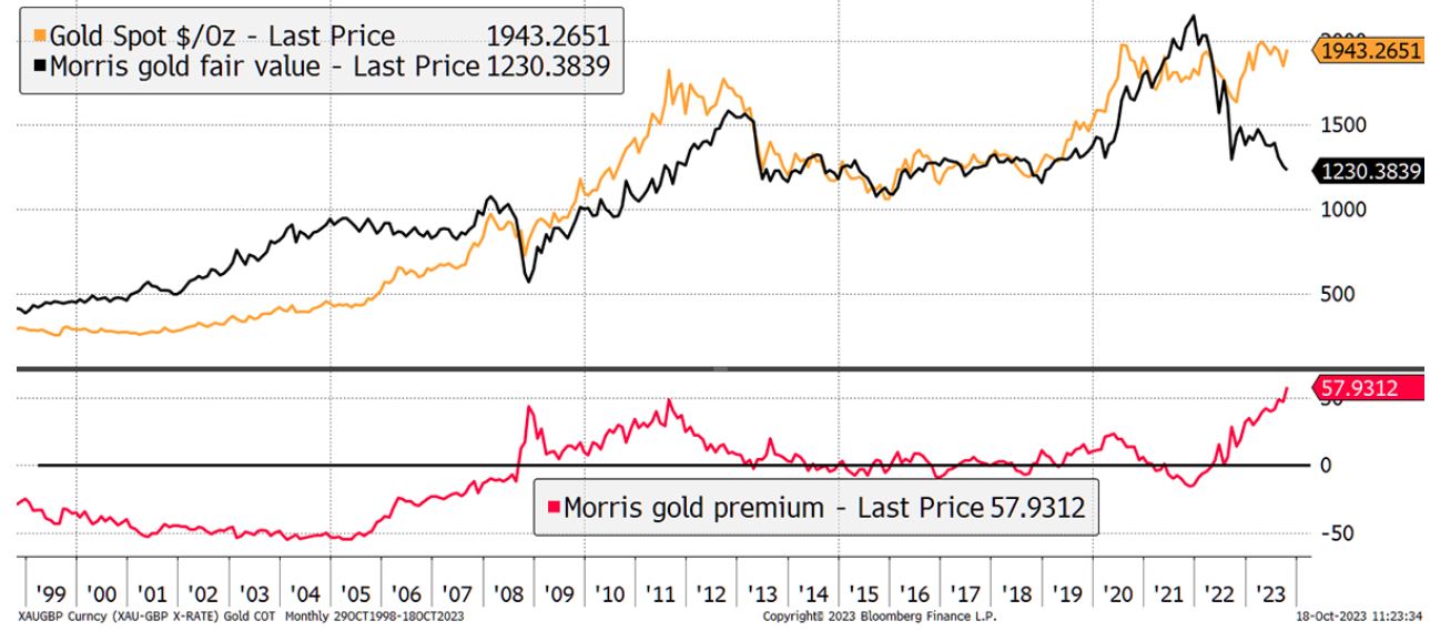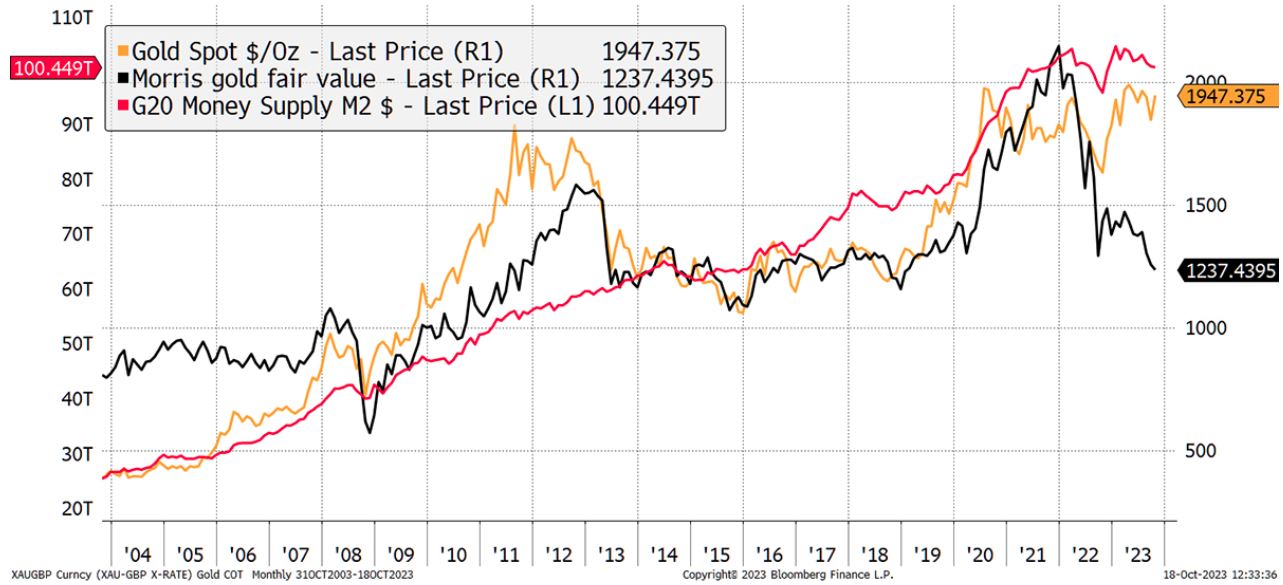 ByteTree首席投资官Charlie Morris表示,在忽略加息和债券收益率飙升的情况下,金价与全球货币供应的关系变得更加紧密。