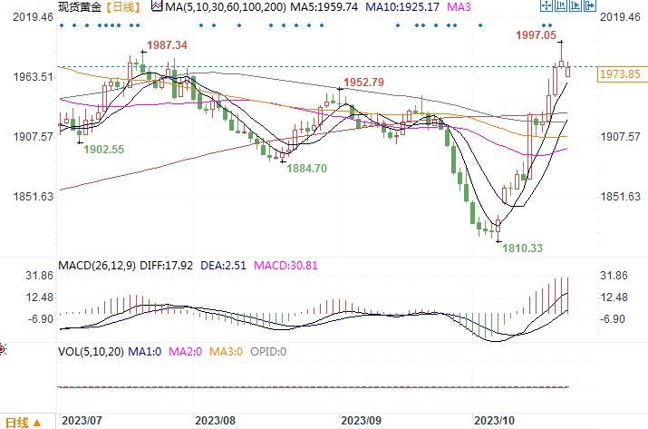 现货黄金日线图北京时间10月23日13:32 现货黄金 报 1973.85 美元/盎司