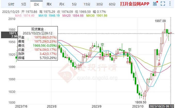本交易日,国际现货黄金1970一线上方小幅拉高,日内黄金价格稳定走势。北京时间10:40,黄金暂报1974.55。