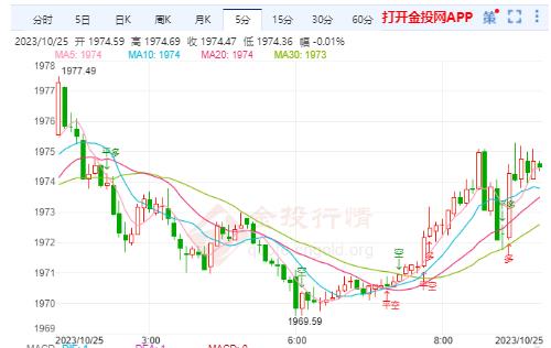 周三(10月25日)本交易日现货黄金日内维持涨势,今日开盘报1970.86美元/盎司,最高触及1976.89美元/盎司,最低触及1969.59美元/盎司,截止发稿金价报1975.95美元/盎司,涨幅0.27%。