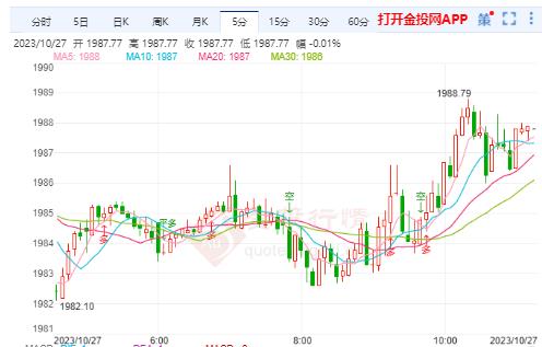 周五(10月27日)本交易日现货黄金维持小幅上涨,今日开盘报1984.67美元/盎司,最高触及1988.79美元/盎司,最低触及1982.58美元/盎司,盎司,截止发稿金价报1987.54美元/盎司,涨幅0.18%。