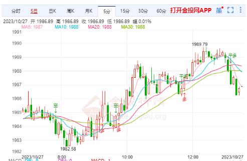 周五(10月27日)本交易日现货黄金维持小幅上涨,今日开盘报1984.67美元/盎司,最高触及1988.79美元/盎司,最低触及1982.58美元/盎司,盎司,截止发稿金价报1987.12美元/盎司,涨幅0.16%。