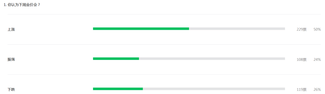 北京黄金经济发展研究中心调查显示,市场人士认为本周国际金价振荡偏多可能性较大。投票显示,有50%的读者看涨本周金价、24%看振荡、26%看空。
