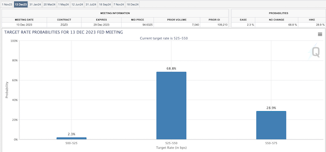 据芝商所利率观察工具(FedWatch Tool),截至第一财经记者发稿时,11月美联储利率决议按兵不动的概率为96.7%,降息25个基点的概率为3.3%;年内维持当前利率水平不变的概率达68.8%,进一步加息25个基点至5.50%~5.75%的可能性为28.9%。
