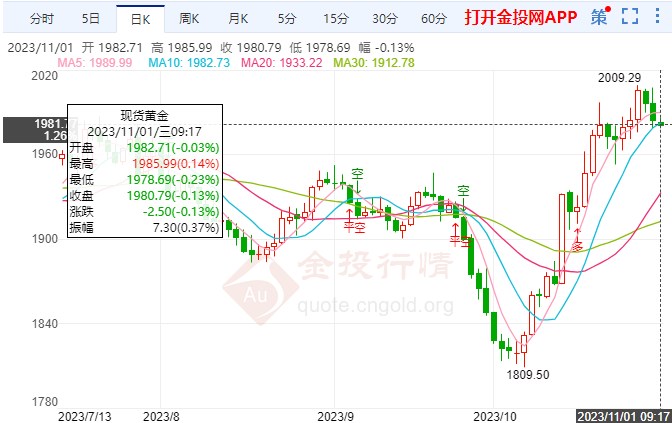 国际现货黄金本交易日偏阴行情,黄金价格1980一线开启小跌势,日内金价区间持续整理行情。