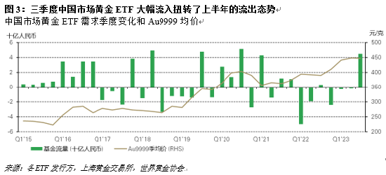 三季度中国市场强劲的黄金ETF需求完全扭转了上半年的小幅流出,令年初至今的净流入达到了40亿元人民币(约合5亿美元),持仓增量略高于8吨。2023年年初至今,人民币金价回报率达到9%,令其他国内资产相形见绌,这或许也对维持投资者对黄金ETF的兴趣起到了关键作用。