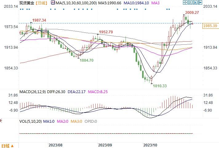 现货黄金日线图北京时间11月2日10:38 现货黄金 报 1985.39 美元/盎司