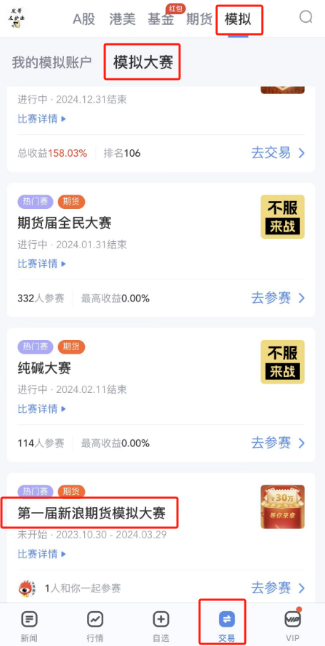 ②新浪财经APP>>交易>>模拟>>模拟大赛>>期货>>第一届新浪期货模拟大赛