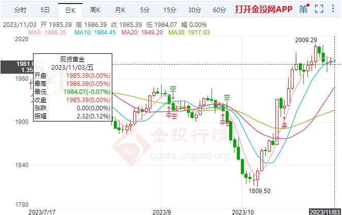 本周五(11月3日),国际现货黄金盘内窄幅下落趋势,日内黄金价格区间震荡慢跌走势。北京时间10:58,黄金暂报1987.10。