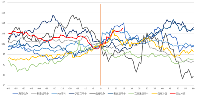 近日在巴以冲突中,黄金的表现相比历史冲突的平均反应要强,接近海湾战争和911事件。(见下图红色线)。其中有一点不同是,金价在冲突前的二到三季度已经调整了近10%。