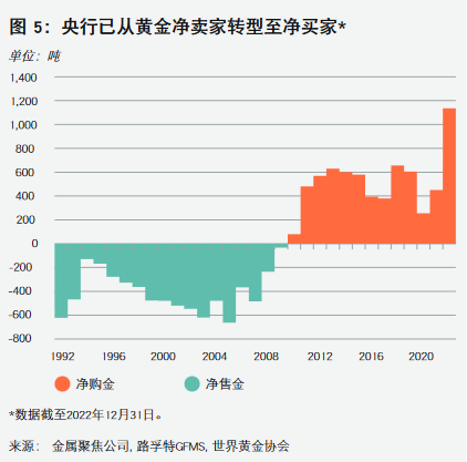 于是2010年起全球央行进入年度黄金净买入时代。尤其是深受美元之苦的新兴市场国家。自全球金融危机之后,各国央行在2010年至 2022 年间购金达 6,815 吨。