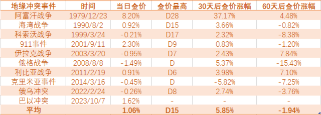 ● 在冲突事件发生当日或次交易日,金价涨跌各半。