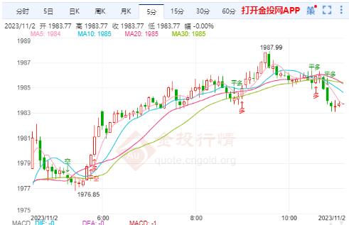 周四(11月2日)本交易日国际金价触底反弹维持涨势,今日开盘报1983.16美元/盎司,最高触及1988.09美元/盎司,最低触及1981.02美元/盎司,截止发稿金价报1983.89美元/盎司,涨幅0.10%。