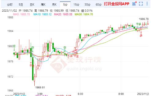 周四(11月2日)本交易日黄金期货触底反弹维持涨势,今日开盘报1983.16美元/盎司,最高触及1987.79美元/盎司,最低触及1981.02美元/盎司,截止发稿金价报1987.44美元/盎司,涨幅0.28%。