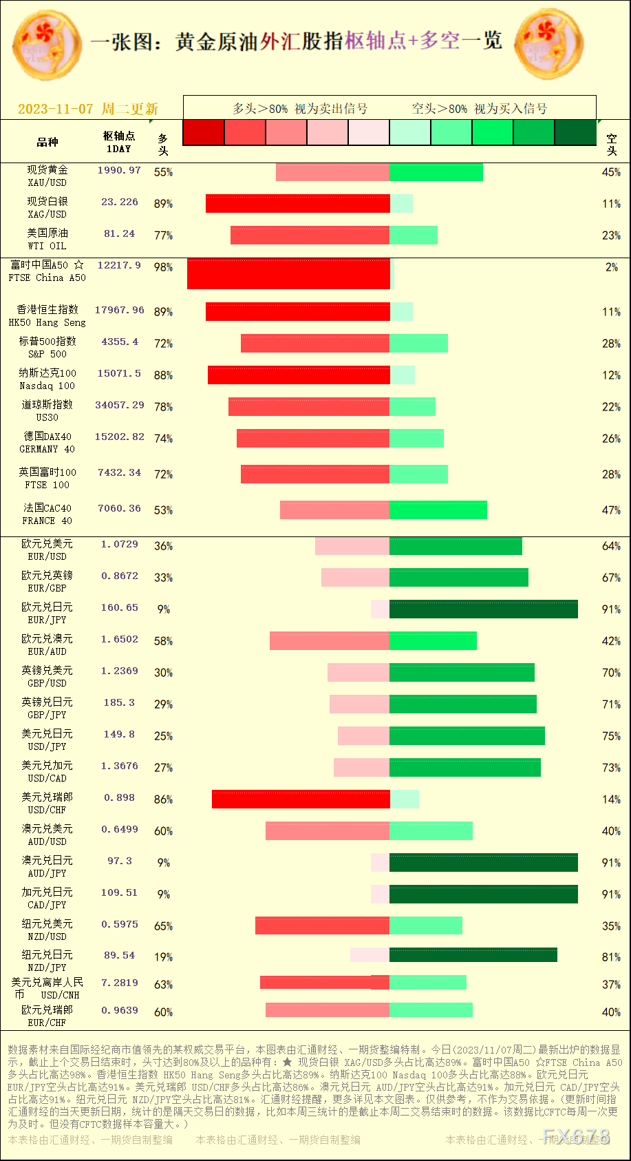 汇通财经APP讯——一张图:黄金原油外汇股指“枢纽点+多空占比”一览。今日(2023/11/07周二)最新出炉的数据显示,截止上个交易日结束时,头寸达到80%及以上的品种有:★ 现货白银 XAG/USD多头占比高达89%。富时中国A50 ☆FTSE China A50多头占比高达98%。香港恒生指数 HK50 Hang Seng多头占比高达89%。纳斯达克100 Nasdaq 100多头占比高达88%。欧元兑日元 EUR/JPY空头占比高达91%。美元兑瑞郎 USD/CHF多头占比高达86%。澳元兑日元 AUD/JPY空头占比高达91%。加元兑日元 CAD/JPY空头占比高达91%。纽元兑日元 NZD/JPY空头占比高达81%。汇通财经提醒,更多详见本文图表。仅供参考,不作为交易依据。