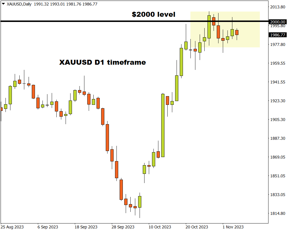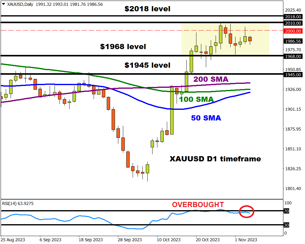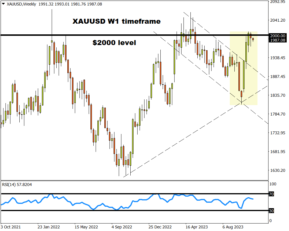 尽管如此,自哈马斯袭击以色列以来,金价仍上涨了8%以上,价格徘徊在2000美元的心理水平附近。 快速浏览一下技术面,周线图上价格看涨,但相对强弱指数 (RSI) 正在慢慢接近超买状况。