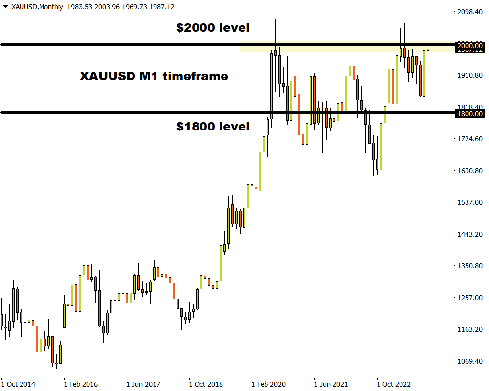 缩小月度图表,价格仍处于非常宽的区间内,关键阻力位为2000美元,支撑位为1800美元。