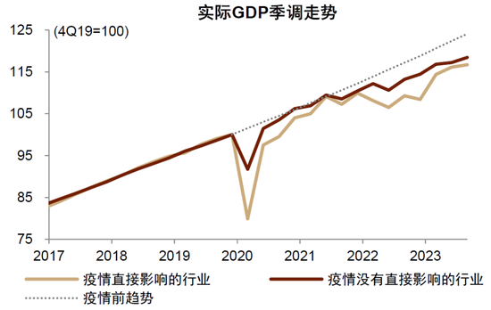 注:数据截至2023年三季度。图中疫情直接影响的接触型服务业包括批发零售、交通运输、住宿餐饮等行业,增加值占比为15%