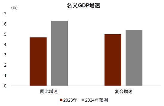 我们预计2023年实际GDP增长为5.3%左右,如果2024年实际GDP增长为5%左右,那么经济动能到底是复苏还是走弱呢?一定程度上因为疫情反弹的冲击,2022年GDP增长为3%,给2023年的增长带来了低基数效应。如果看两年复合增速,2023年大概为4.1%左右。这么来看,如果2024年增长为5%左右,那么经济动能似乎是“跳跃式”的复苏。但2024年GDP增长也有2022年的基数影响,若以三年复合增速来看,2024年的复合增速大约为4.5%左右,较疫情比较严重的2020年和2022年均有比较明显的提速。因此,2024年5%左右的增长既不是缓慢复苏,也不是跳跃式复苏,而是呈现逐步加快的态势(图表18)。2024年名义GDP增速明显快于实际GDP增速,对企业盈利和估值带来利好。根据我们的预测,2024年名义GDP增速可能为6.3%左右,明显高于2023年的4.7%左右(图表19)。