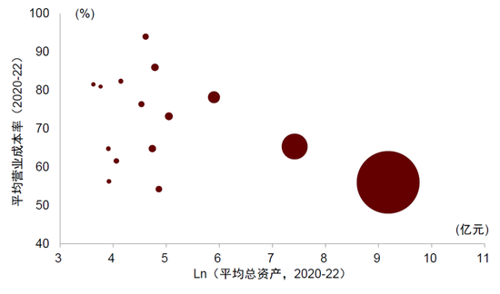 注:图中气泡大小代表企业2022年总资产的规模大小。营业成本率为企业营业成本与营业收入之比。营业成本率和总资产均使用2020-22年的三年平均值